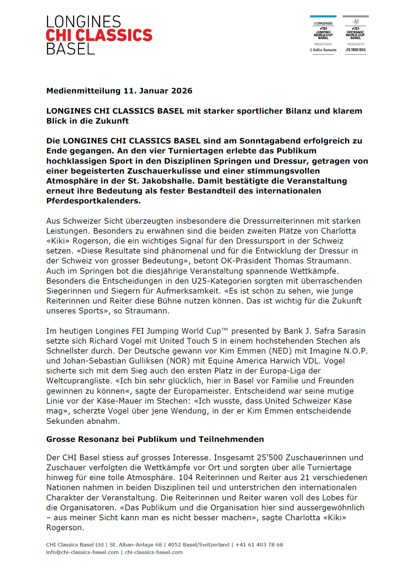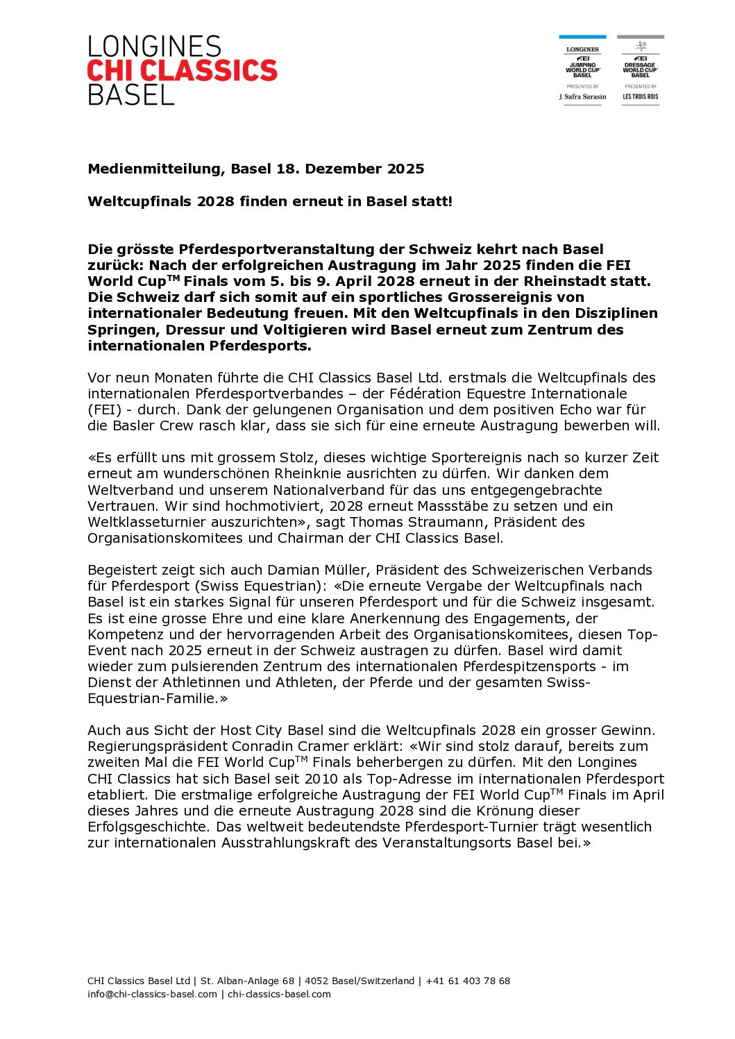 Die Administration der LONGINES CHI CLASSICS BASEL ist montags bis freitags von 08.30 – 11.30 Uhr erreichbar.